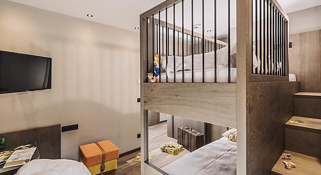 Im Kinderzimmer warten drei Betten – darunter ein cooles Stockbett der neuen Generation, das Abenteuerlust weckt. Dazu gibt’s einen begehbaren Kleiderschrank, eine großzügige Dusche zum Wachwerden, einen Doppelwaschtisch mit viel Ablagefläche und ein extra WC – superpraktisch!